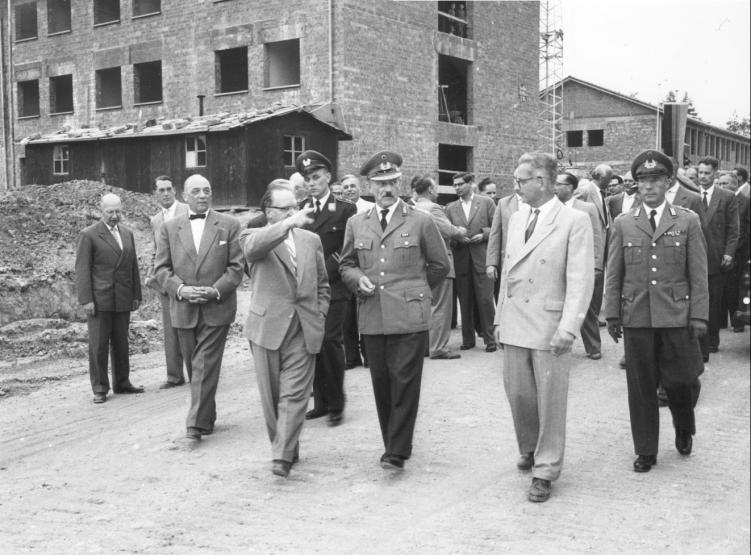 | Der Hausherr mit den Vertretern der Stadt Walldürn, der Liegenschaftverwaltung und des Verteidigungsministeriums beim ersten Gang durch die Kaserne mit ihren Rohbauten. |