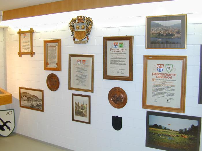 | Die Andenken an unsere Patenschaften mit den Gemeinden im Umland finden sich an dieser Wand im Traditionsraum. (Bild: 50 KB) |